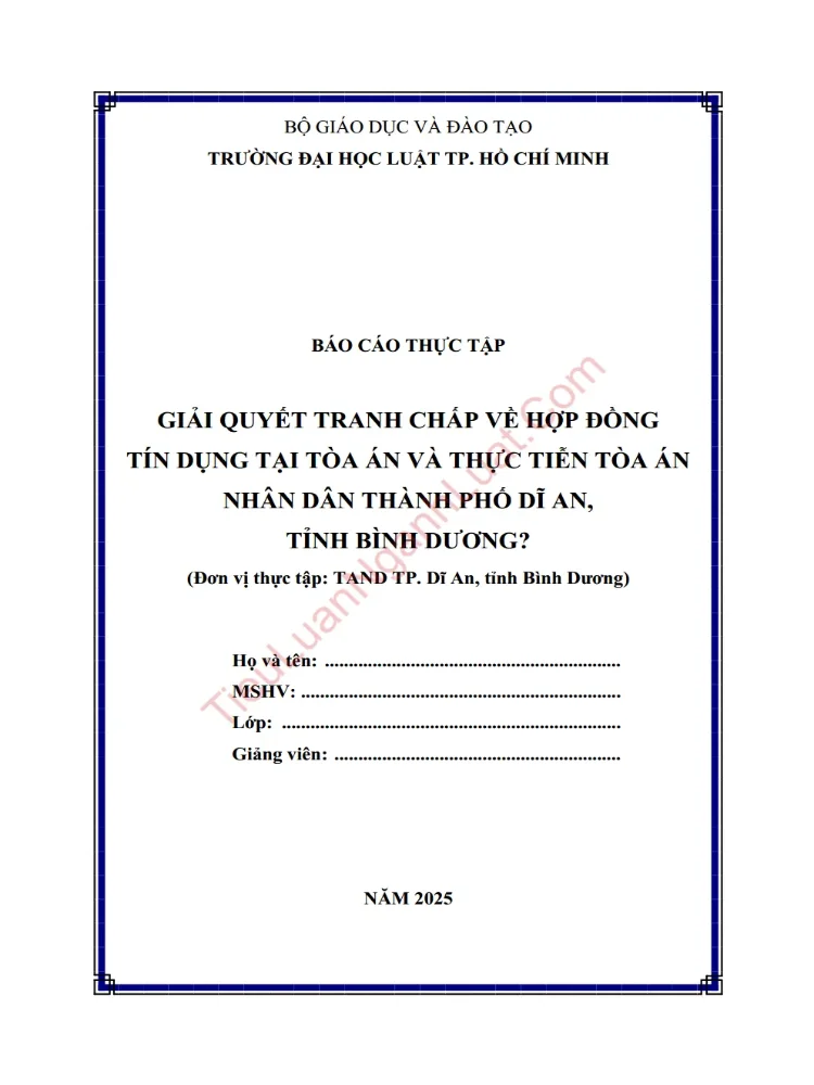 Có thể nói rằng, trong thời gian gần đây số lượng tranh chấp HĐTD được đưa ra giải quyết tại TAND thành phố Dĩ An, tỉnh Bình Dương có chiều hướng gia tăng. Vì vậy, việc chọn “Giải quyết tranh chấp về HĐTD tại Tòa án và thực tiễn TAND thành phố Dĩ An, tỉnh Bình Dương” làm đề tài báo cáo thực tập là vô cùng cần thiết. Nhằm góp phần phát hiện những điểm hạn chế, tạo điều kiện thuận lợi cho việc giải quyết tranh chấp HĐTD. Từ đó nâng cao hiệu quả áp dụng pháp luật trong quá trình giải quyết tranh chấp tại Tòa án nói chung và TAND thành phố Dĩ An, tỉnh Bình Dương nói riêng.