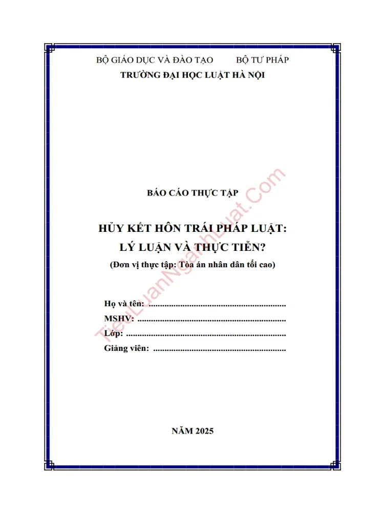 Đất nước ta đang trong quá trình đổi mới, nhiều lĩnh vực trong xã hội đã phát triển nhanh và xa hơn trước. Diện mạo đời sống xã hội đã có nhiều sự đổi thay. Và gia đình cũng không nằm ngoài quy luật đó. Chúng ta đều biết, gia đình là tế bào của xã hội. Xã hội đã khác xưa, không cớ gì cái tế bào của nó lại không thay đổi. Gia đình truyền thống giờ đã biến đổi để thích nghi với điều kiện xã hội hiện nay để trở thành những gia đình hiện đại. Khi mà đời sống vật chất của con người ngày càng đầy đủ hơn thì cái người ta quan tâm sau đó chính là yếu tố tinh thần. Là một cuộc sống văn minh, hiện đại. Cùng với sự phát triển không ngừng của các lĩnh vực như văn hóa, công nghệ, khoa học kỹ thuật… thì ngành luật ở Việt Nam cũng không ngừng hoàn thiện để phục vụ cuộc sống. Kết hôn trái pháp luật là một trong những vấn đề được Đảng, nhà nước, các cơ quan có thẩm quyền và toàn xã hội đặt biệt quan tâm và để hạn chế được tình trạng này và nhằm đảm bảo tính nghiêm minh của pháp luật, đòi hỏi phải có những quy định rõ ràng, cụ thể về vấn đề huỷ kết hôn trái pháp luật. Với đề tài báo cáo này tác giả mong muốn được tìm hiểu sâu sắc hơn về mặt lý luận và thực tiễn áp dụng của vấn đề huỷ kết hôn trái pháp luật, trên sơ sở đó đề xuất các kiến nghị tiếp tục hoàn thiện pháp luật về vấn đề này là rất rất cần thiết, có ý nghĩa quan trọng cả về lý luận và thực tiễn trong giai đoạn hiện nay. Với những lý do trên, tác giả xin chọn đề tài: “Huỷ kết hôn trái pháp luật – lý luận và thực tiễn” làm đề tài tiểu luận báo cáo thực tập của mình. Công trình nghiên cứu giúp cho mọi người có cái nhìn tổng quát hơn về một vấn đề nóng bỏng của xã hội, dự liệu thêm các trường hợp phát sinh, hoàn thiện hơn nữa cách khắc phục, giải quyết các trường hợp vi phạm nhằm hướng đến một hệ thống pháp luật hoàn chỉnh hơn.