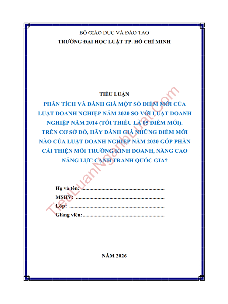 Luật Doanh nghiệp 2020 được kỳ vọng sẽ mang đến thay đổi đáng kể đối với môi trường kinh doanh nói chung cũng như đến các doanh nghiệp, nhà đầu tư nói riêng. Chính vì lí do đó, trong bài tiểu luận lần này, em sẽ đi sâu nghiên cứu đề tài: “Phân tích và đánh giá một số điểm mới của Luật Doanh nghiệp năm 2020 so với Luật Doanh nghiệp năm 2014 (tối thiểu là 05 điểm mới). Trên cơ sở đó, hãy đánh giá những điểm mới nào của Luật Doanh nghiệp năm 2020 góp phần cải thiện môi trường kinh doanh, nâng cao năng lực cạnh tranh quốc gia”.
