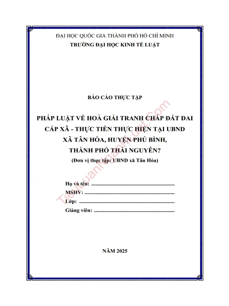 Với đề tài “Pháp luật về hoà giải tranh chấp đất đai cấp xã – Thực tiễn thực hiện tại UBND xã Tân Hòa, huyện Phú Bình, thành phố Thái Nguyên”. Báo cáo thực tập chủ yếu tìm hiểu và phân tích các vấn đề như sau: