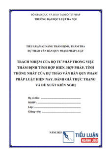 [Tiểu luận 2025] Trách nhiệm của Bộ Tư pháp trong việc thẩm định tính hợp Hiến, hợp pháp, tính thống nhất của dự thảo Văn bản quy phạm pháp luật hiện nay. Đánh giá thực trạng và đề xuất kiến nghị?Ngày đăng: 16/01/2025 Người đăng: Phạm Văn ThànhTHÔNG TIN TIỂU LUẬNTrường: Đại học Luật Hà NộiĐịnh dạng: WORDSố trang: 12 trang (Không bao gồm bìa, Mục lục)Năm: 2025 / Mã số: B0696.