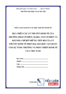 [Tiểu luận 2025] Dựa trên các lý thuyết kinh tế của trường phái cổ điển, Marx, tân cổ điển và Keynes, chỉ rõ những tiến bộ của Lý thuyết kinh tế hiện đại. Bài học vận dụng vào sự tăng trưởng và phát triển kinh tế của Việt NamNgày đăng: 11/01/2025 Người đăng: Phạm Văn ThànhTHÔNG TIN TIỂU LUẬNTrường: Đại học Luật Hà NộiĐịnh dạng: WORDSố trang: 36 trang (Không bao gồm bìa, Mục lục)Năm: 2025 / Mã số: B0582.