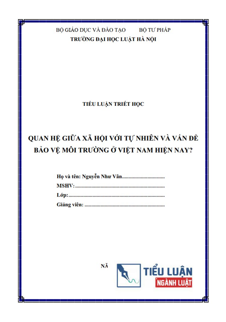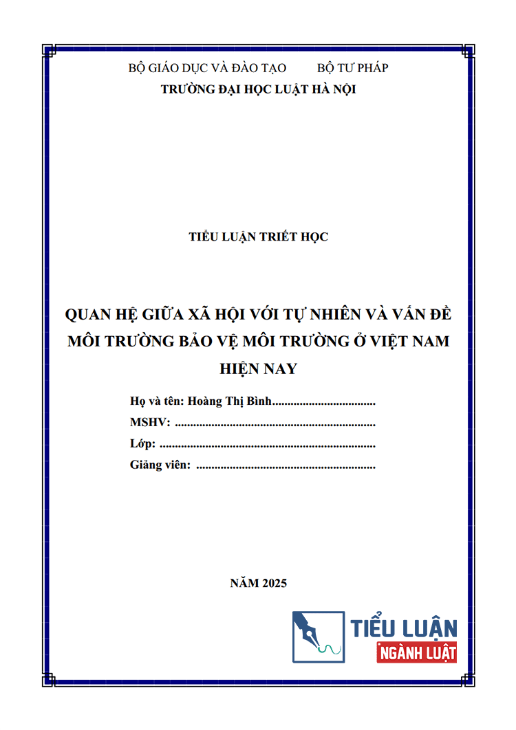 [Tiểu luận 2025] Quan hệ giữa xã hội với tự nhiên và vấn đề môi trường bảo vệ môi trường ở Việt Nam hiện nay (Bài 21)THÔNG TIN TIỂU LUẬNTrường: Đại học Luật Hà NộiĐịnh dạng: WORDSố trang: 17 trang (Không bao gồm bìa, Mục lục)Năm: 2025 / Mã số: A0260.