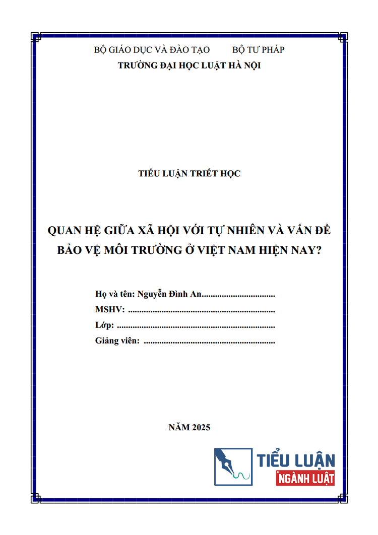 [Tiểu luận 2025] Quan hệ giữa xã hội với tự nhiên và vấn đề môi trường bảo vệ môi trường ở Việt Nam hiện nay (Bài 17)THÔNG TIN TIỂU LUẬNTrường: Đại học Luật Hà NộiĐịnh dạng: WORDSố trang: 15 trang (Không bao gồm bìa, Mục lục)Năm: 2025 / Mã số: A0236.