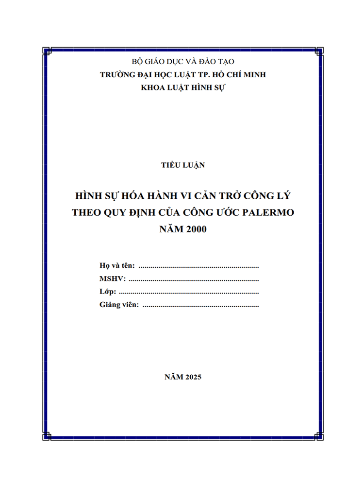 [Tiểu luận 2025] Hình sự hóa hành vi cản trở công lý theo Công ước Palermo 2000 (8.5 điểm) (MS-B0941)THÔNG TIN TIỂU LUẬNTrường: Đại học Luật TP. Hồ Chí MinhĐịnh dạng: WORDSố trang: 14 trang (Không bao gồm bìa, Mục lục)Năm: 2025 / Mã số: B0941.