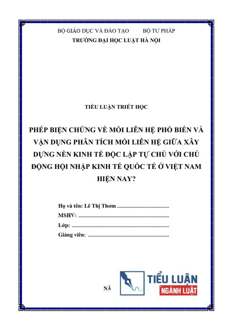 [Tiểu luận 2025] Phép biện chứng về mối liên hệ phổ biến và vận dụng phân tích mối liên hệ giữa xây dựng nền kinh tế độc lập tự chủ với chủ động hội nhập kinh tế quốc tế (Bài 5)THÔNG TIN TIỂU LUẬNTrường: Đại học Luật Hà NộiĐịnh dạng: WORDSố trang: 19 trang (Không bao gồm bìa, Mục lục)Năm: 2025 / Mã số: A0272.