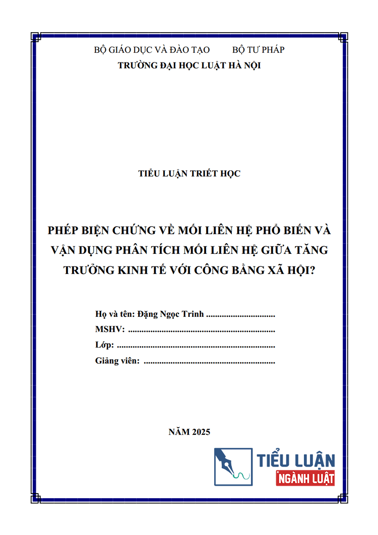 [Tiểu luận 2025] Phép biện chứng về mối liên hệ phổ biến và vận dụng phân tích mối liên hệ phổ biến giữa tăng trưởng kinh tế với công bằng xã hội (Bài 11)THÔNG TIN TIỂU LUẬNTrường: Đại học Luật Hà NộiĐịnh dạng: WORDSố trang: 16 trang (Không bao gồm bìa, Mục lục)Năm: 2025 / Mã số: A0336.