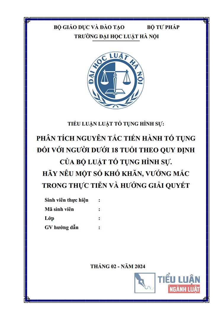 [Tiểu luận 2024] Phân tích những quy định mới của BLTTHS năm 2015 về nguyên tắc tiến hành tố tụng đối với người dưới 18 tuổiTHÔNG TIN TIỂU LUẬNTrường: Đại học Luật Hà NộiĐịnh dạng: WORDSố trang: 19 trang (Không bao gồm bìa, Mục lục)Năm: 2024 / Mã số: B0431.Văn bản áp dụng: Bộ luật Tố tụng hình sự năm 2015 (sửa đổi, bổ sung năm 2021).