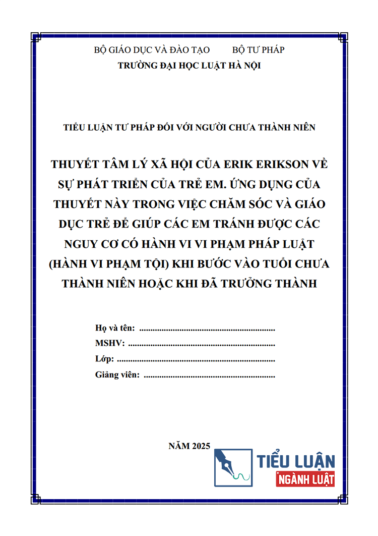 [Tiểu luận 2025] Thuyết tâm lý xã hội của Erik Erikson về sự phát triển của trẻ em. Ứng dụng của thuyết này trong việc chăm sóc và giáo dục trẻ để giúp các em tránh được các nguy cơ có hành vi vi phạm pháp luật (hành vi phạm tội) khi bước vào tuổi chưa thành niên hoặc khi đã trưởng thànhTHÔNG TIN TIỂU LUẬNTrường: Đại học Luật Hà NộiĐịnh dạng: WORDSố trang: 17 trang (Không bao gồm bìa, Mục lục)Năm: 2025 / Mã số: B0661.