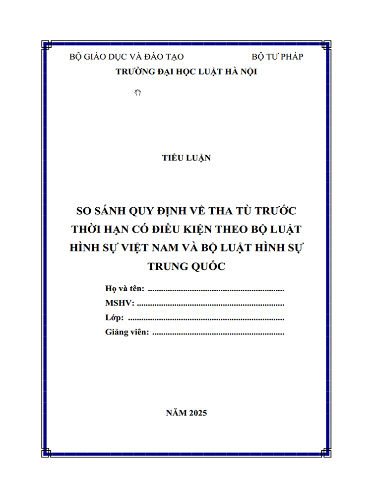 [Tiểu luận 2025] So sánh quy định về tha tù trước thời hạn có điều kiện theo BLHS Việt Nam và BLHS Trung Quốc (8.75 điểm) (MS-B0976)THÔNG TIN TIỂU LUẬNTrường: Đại học Luật Hà NộiĐịnh dạng: WORDSố trang: 09 trang (Không bao gồm bìa, Mục lục)Năm: 2025 / Mã số: B0976.