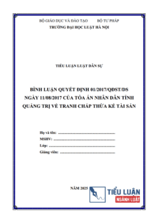 [Tiểu luận 2025] Bình luận Quyết định số 01/2017/QĐST/DS ngày 11/08/2017 của Tòa án nhân dân tỉnh Quảng Trị về tranh chấp thừa kế tài sảnNgày đăng: 11/01/2025 Người đăng: Phạm Văn ThànhTHÔNG TIN TIỂU LUẬNTrường: Đại học Luật Hà NộiĐịnh dạng: WORDSố trang: 10 trang (Không bao gồm bìa, Mục lục)Năm: 2025 / Mã số: B0586.