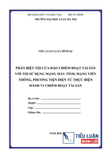 [Tiểu luận 2025] Phân biệt Tội lừa đảo chiếm đoạt tài sản và Sử dụng mạng máy tính thực hiện hành vi chiếm đoạt tài sảnNgày đăng: 19/01/2025 Người đăng: Phạm Văn ThànhTHÔNG TIN TIỂU LUẬNTrường: Đại học Luật Hà NộiĐịnh dạng: WORDSố trang: 17 trang (Không bao gồm bìa, Mục lục)Năm: 2025 / Mã số: B0764.