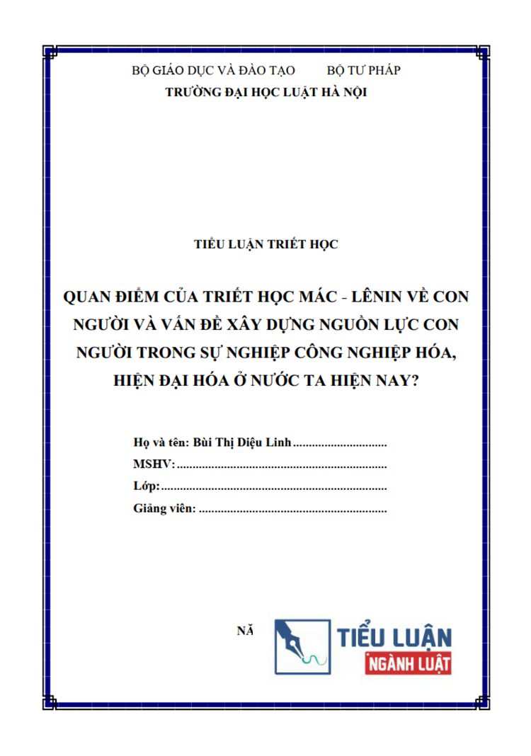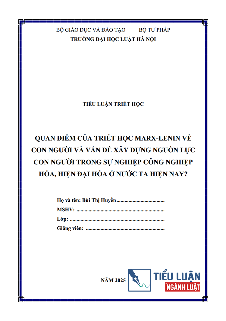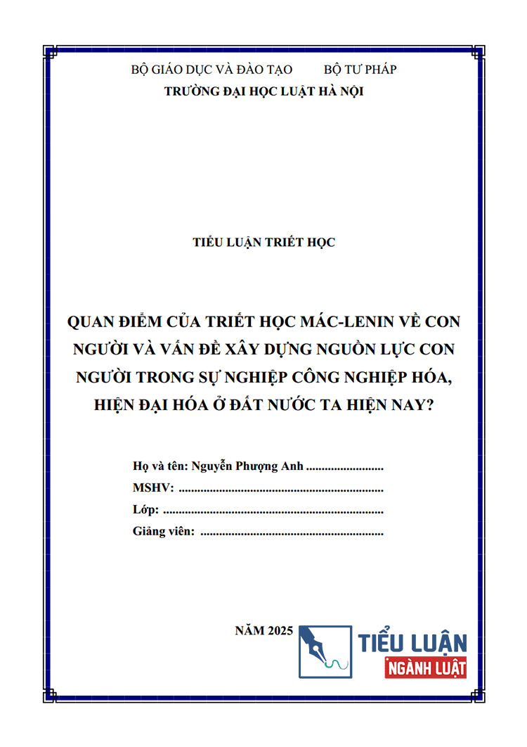 [Tiểu luận 2025] Quan điểm của triết học Mác-Lênin về con người và vấn đề xây dựng nguồn lực con người trong sự nghiệp công nghiệp hóa, hiện đại hóa ở nước ta (Bài 11)THÔNG TIN TIỂU LUẬNTrường: Đại học Luật Hà NộiĐịnh dạng: WORDSố trang: 17 trang (Không bao gồm bìa, Mục lục)Năm: 2025 / Mã số: A0228.